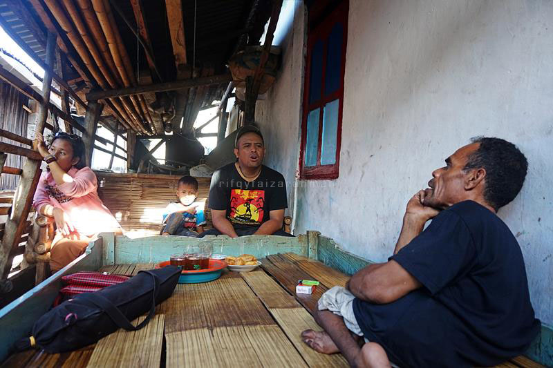 Arman (kaus hitam, tengah) bilang, “Kalau setiap keliling kampung disuruh pemilik rumah mampir, kita harus mampir. Nanti kalau ditolak bisa tersinggung.” Tak heran, perut selalu kenyang dengan suguhan roti dan teh atau kopi panas dari setiap rumah yang didatangi. Hemat Dahlan (duduk membelakangi kamera) adalah salah satu warga yang mengajak mampir.