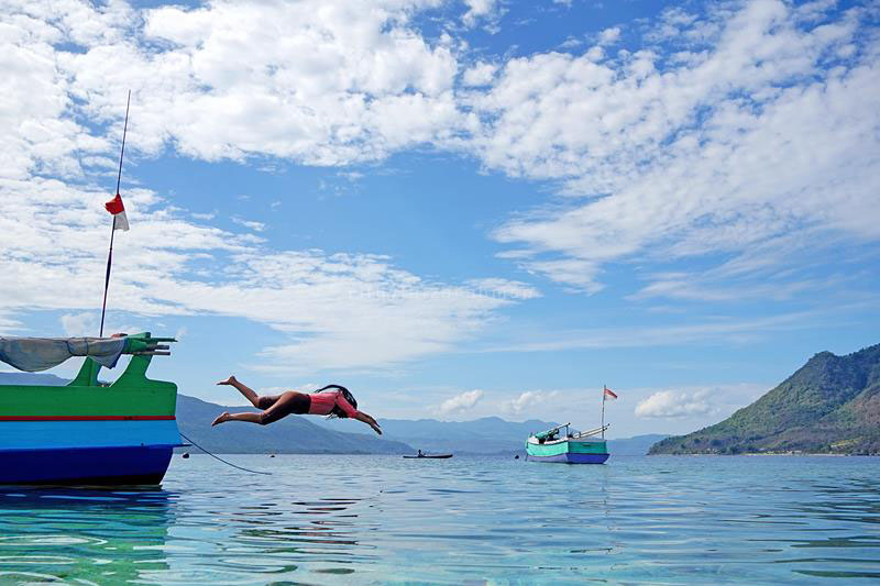 Hiburan seru di Pulau Buaya tak jauh-jauh dari aktivitas di laut. Selain memancing, aktivitas seru lainnya adalah menyelam atau sekadar berenang. Mandi laut sudah jadi kegiatan sehari-hari warga di sini.