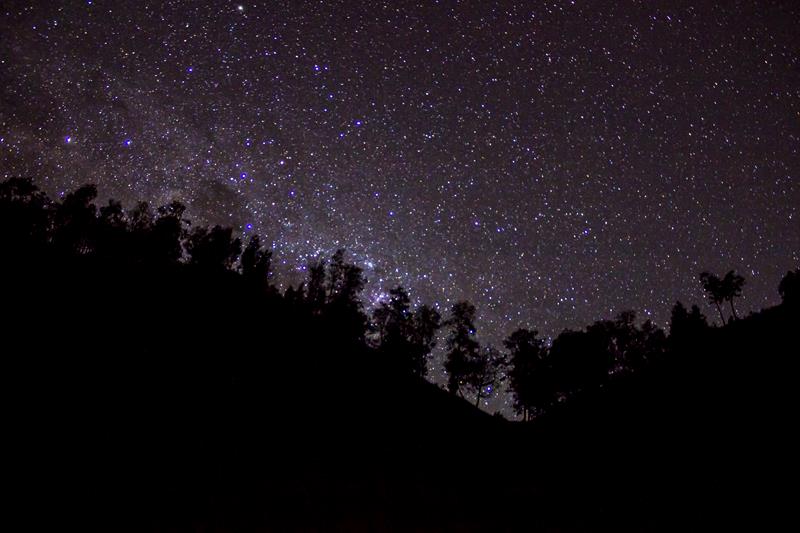 Saya sempat menoleh ke belakang. Melihat siluet bukit di ujung Tanjakan Cinta. Tampak jelas gurat cemara-cemara gunung seperti menukik. Mengikuti kontur tanah. Di atasnya bintang-bintang kian menyemut, seakan menyentuh pucuk pepohonan.