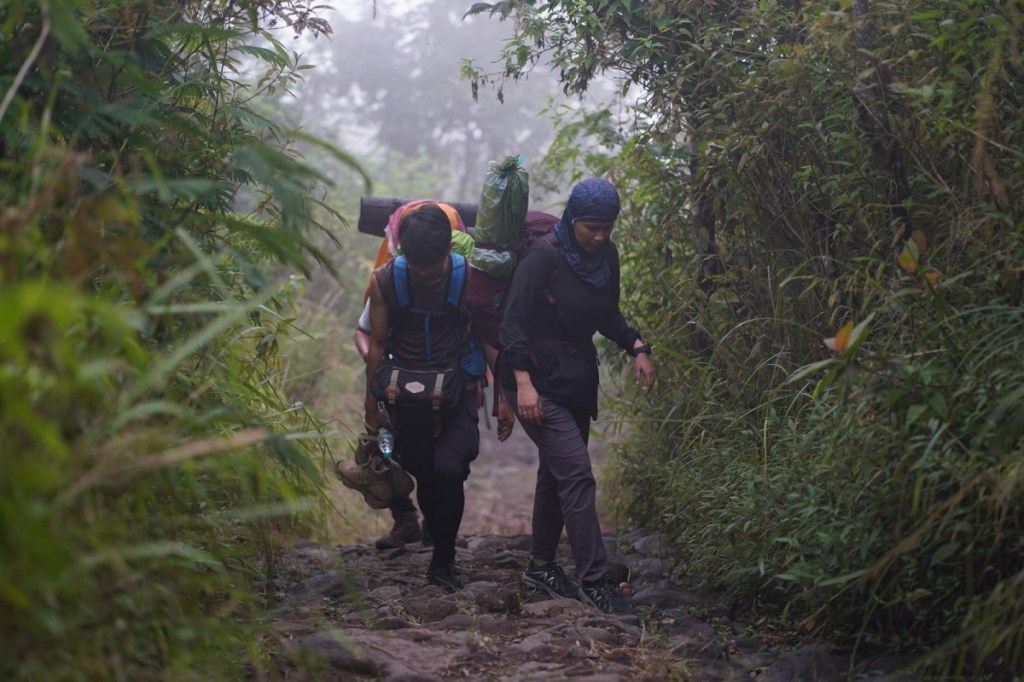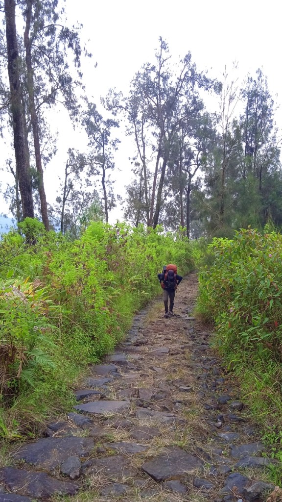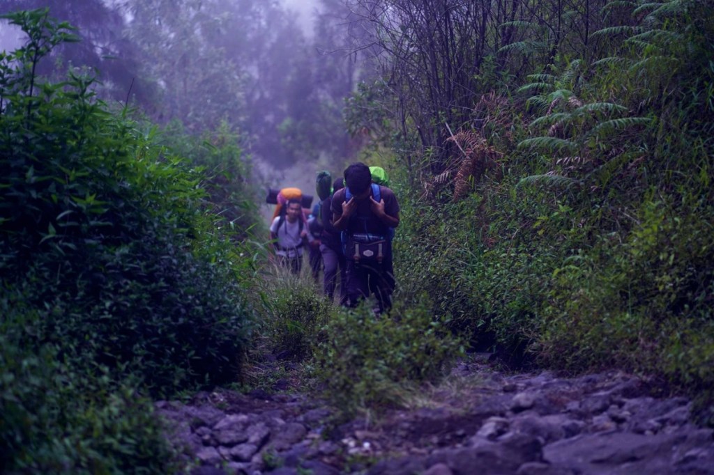 Aku hanya berharap kesialannya tidak sampai menular ke rekan-rekan yang lain. “Semoga tetap tabah, Man.” Ketabahan itu juga kami butuhkan untuk mendaki sebuah tanjakan terjal yang cukup panjang di depan mata. Petang yang menyergap dan langit meredup seperti merupakan kombinasi suram yang melatari langkah kaki kami.