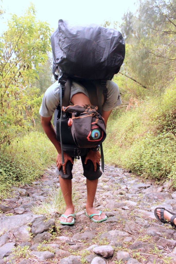 Pada sebuah tikungan yang kesekian kali, Totok dan Gipong menunggu kami sembari istirahat. Aku dan teman-teman lainnya ikut istirahat sejenak. Mumpung suasana teduh di bawah naungan pepohonan yang cukup rimbun. Ransel jumbo yang diangkut Gipong tergeletak begitu saja di atas makadam. Eko sempat mencoba mengangkatnya, tapi tak berdaya.