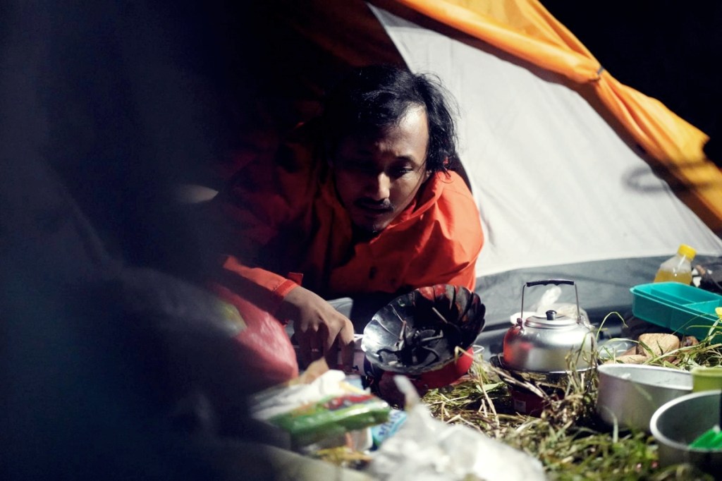 Seluruh tenda, kecuali milik Bartian (kapasitas 1 orang), dibawa oleh kloter terdepan. Aku mengeluarkan tenda dome berkapasitas empat orang dari ransel. Begitu pun Aiman dan Jun yang bersiap membangun tenda yang sama-sama muat dua orang. Satu tenda dipinjam dari Cecep, kawan pendaki yang batal ikut—dialah kepala dapur sesungguhnya—lalu satu tenda lagi disewa dari tempat rental dekat rumah Jun di Gresik.