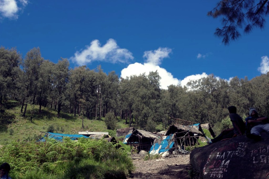 Pertanda itu semakin jelas memberi jawaban. Sekelompok pendaki dalam tenda-tenda berderet di petak-petak tanah yang rata. Sebuah pohon di sisi kanan jalur pendakian dekat batu besar menjelma gerbang yang menyambut kami. Penuh dengan tempelan beragam informasi jalur pendakian ke puncak Welirang, Arjuno, dan Lembah Kidang. Dan satu ikon yang jelas dari pos ini adalah pondok-pondok sederhana beratap jerami bak permukiman hobbits di Shire. Hunian para penambang belerang. Dari sana pos ini mendapat namanya: Pondokan.